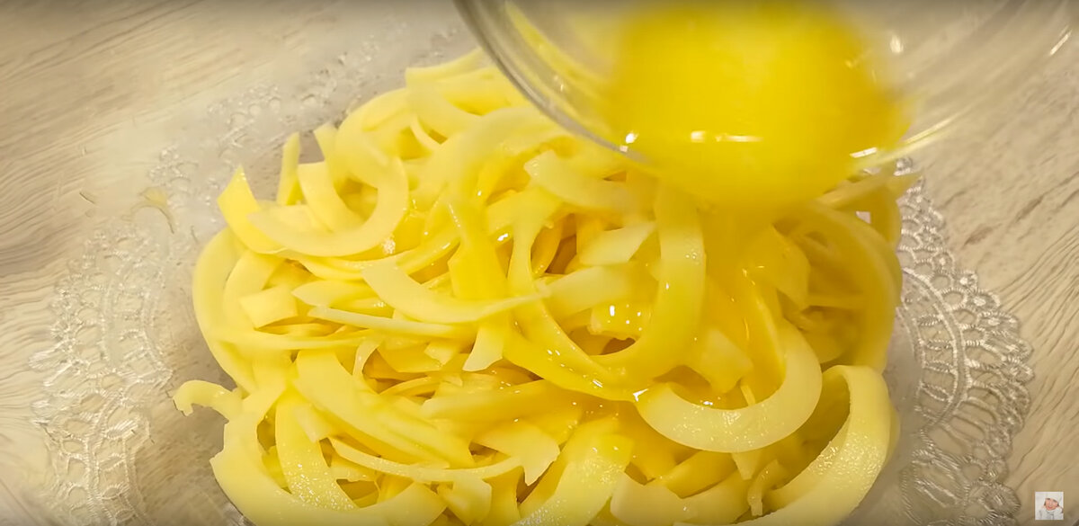 Первый шаг — подготовьте картофель. Главное – тщательно очистить корнеплод и нарезать его. Для этого можно использовать кухонный комбайн, который быстро справится с задачей, или выбрать традиционный способ: использовать овощечистку, натереть на крупной терке либо нарезать тонкими ломтиками ножом.