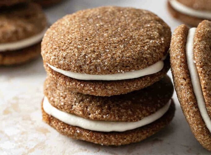 В завершение готовится начинка: сливочный сыр взбивается с сахарной пудрой и ванилью, а затем помещается между печеньями, образуя восхитительный десерт.