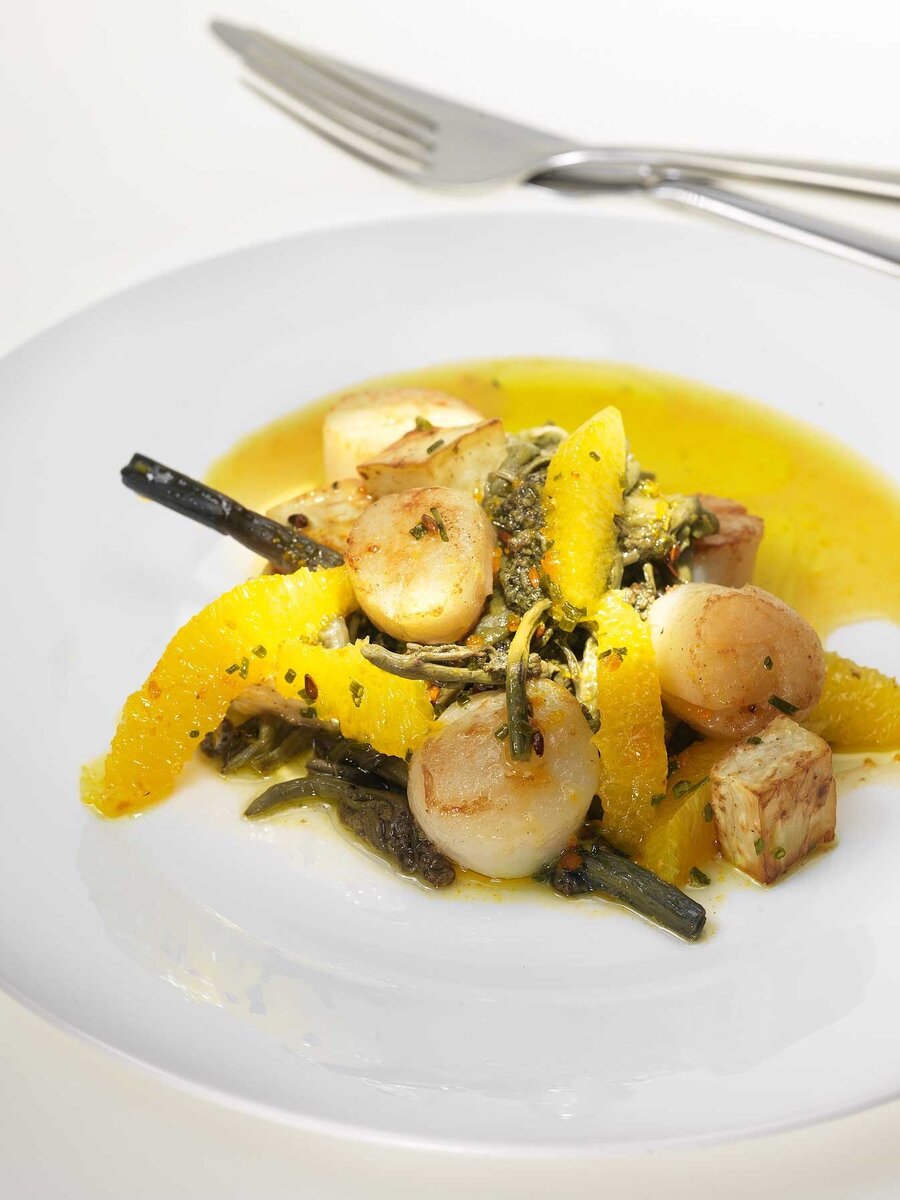 Промыть папоротник и замочить его в 75 мл оливкового масла на 15 минут. После этого масло слить.Корень сельдерея нарезать средними кубиками и отварить до почти полной готовности.Один апельсин очистить, разделить на дольки и удалить пленку. Из оставшихся апельсинов выжать сок. Лук мелко нарезать.Выпарить апельсиновый сок на слабом огне до состояния сиропа, затем смешать с облепиховым вареньем. Посолить и поперчить по вкусу.Обжарить кубики сельдерея на сливочном масле до золотистой корочки, морские гребешки до легкого румянца с обеих сторон, а папоротник — чуть-чуть.В теплый соус добавить оставшееся оливковое масло, дольки апельсина и лук. После этого добавить переваренный сельдерей, грибы и папоротник. Аккуратно перемешать и разложить по тарелкам.