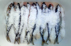 Этот метод подходит для больших партий рыбы. Важно использовать глубокие деревянные ящики с небольшими промежутками для стока излишков жидкости. Тщательно просаливайте головы и укладывайте тушки слоями, посыпая солью каждый слой. Накрыть ящик прессом, и оставить на 2-3 недели. После этого, промыть рыбу и подвесить ее в вентилируемом месте для окончательной просушки.