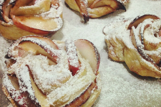 Очистите яблоки, разрезав их на четвертинки и удалив сердцевину. Затем нарежьте яблоки тонкими дольками — примерно по 2 миллиметра.В небольшой кастрюле доведите 200 мл воды до кипения, добавив немного сахара.Опустите дольки яблок в кипящую воду и варите их 2–3 минуты, чтобы они стали мягкими. После этого тщательно слейте воду.Размороженное тесто раскатайте до толщины 1-2 мм. Нарежьте его на длинные полосы шириной 3 см и длиной 25–30 см.На каждую полоску теста выложите пять яблочных долек так, чтобы они немного перекрывали друг друга и выступали за край теста. Аккуратно сверните полоску в рулет.Загните нижние края теста внутрь, чтобы начинка не вываливалась.Выложите получившиеся розочки на противень, предварительно застеленный пергаментной бумагой. Выпекайте в разогретой до 200 градусов духовке в течение 30 минут.После готовности дайте слоечкам полностью остыть и посыпьте их сахарной пудрой, смешанной с корицей.Вдохновение для кулинаров
