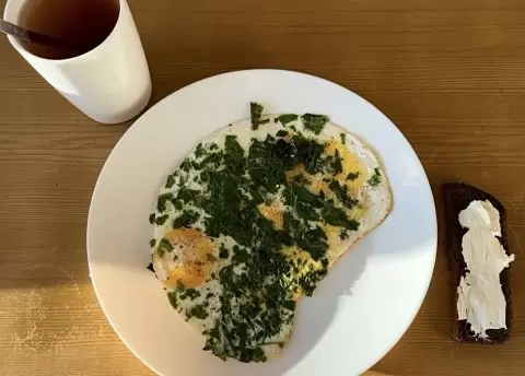 Завтрак стал настоящим символом тепла: глазунья со шпинатом, ломтик черного хлеба с нежным творожным сыром и чашка горячего чая поднимают настроение! К тому же, такой меню легко готовить за считанные минуты, а приятно провести время вместе за общим столом — самое важное.