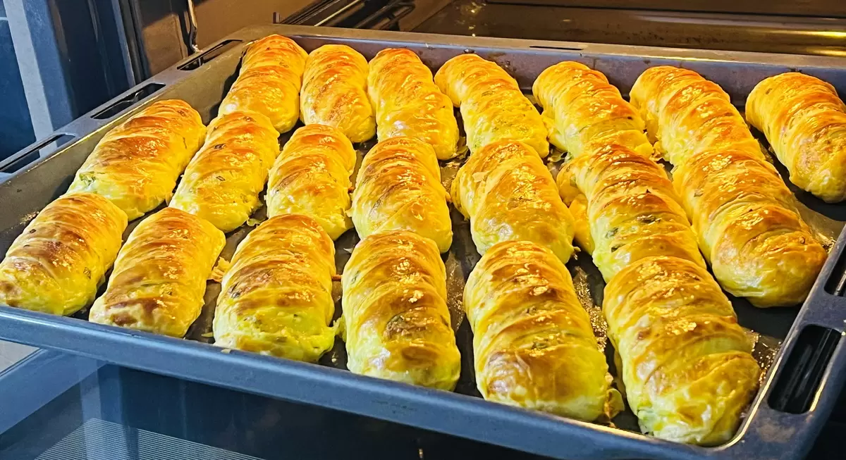 Разогрейте духовой шкаф до 180 градусов. Каждый из слоёв раскатайте в прямоугольный пласт, разместите в центре начинку и формируйте мешочек, который затем аккуратно раскатайте в лепёшку. Наконец, сделайте надрезы по бокам, сверните в трубочку и смажьте желтком.