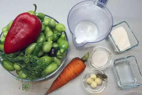 В глубокой миске соединяются морковь, болгарский и острый перцы, а также чеснок. Все ингредиенты следует хорошенько перемешать.