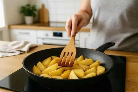 Если вы планируете добавление лука, делайте это позже – когда картошка уже подрумянилась. Этот прием предотвратит подгорание лука до готовности картошки.