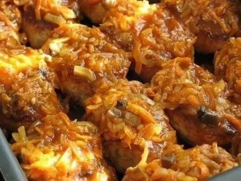 Для соуса лук нарезается полукольцами, обжаривается до мягкости, а затем к нему добавляется натертая морковь и оставшаяся часть грибов. Томатная паста разводится в теплой воде или можно использовать помидоры в собственном соку. Соус посолить и приправить хмели-сунели, довести на слабом огне до готовности.