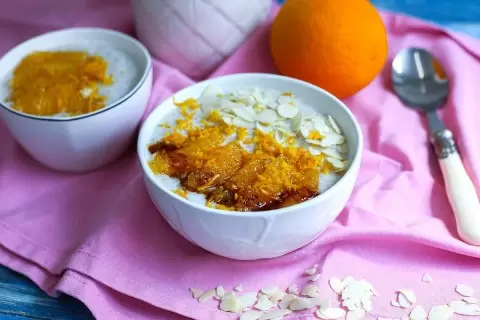 Шаг 2: Подавайте кашу порционно, украшая дольками апельсина, миндальными лепестками и цедрой.
