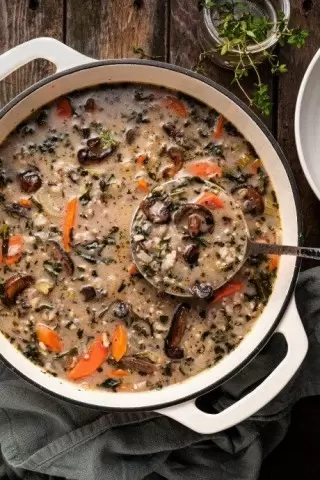 В самом конце добавьте шпинат или капусту кейл, варите еще 2-3 минуты до мягкости зелени. Затем вмешайте грибы, приправьте солью и перцем по вкусу. Ваш великолепный грибной суп готов!