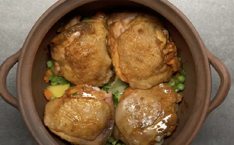 На дно каждого горшочка выкладывается часть картофеля, курицы, лука с морковью, затем зелёный горошек, чеснок и свежая петрушка для аромата. Это делается в несколько слоев, после чего все ингредиенты заливаются горячей водой и помещаются в разогретую духовку. Приготовление займет около полутора часов, в результате чего курица станет невероятно мягкой, а овощи сохранят свои соки и ароматы.