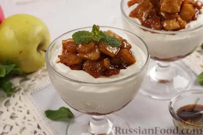 - Творожно-сметанный десерт с карамелизированными яблоками: Воздушное сочетание творога со сметаной и сладкими карамелизированными яблоками станет настоящим хитом на вашем столе.