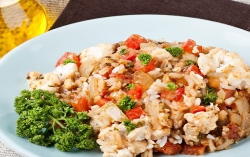 4. Мелко нарезанную петрушку добавить в соус. Затем рыбное филе нарезается на средние кусочки и помещается в соус с рисом. Блюдо присыпается тимьяном, накрывается крышкой и тушится на минимальном огне до готовности рыбы.